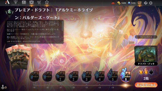 アルケミーホライゾン:バルダーズ・ゲートランクドラフト、緑黒ランプで7-2です。