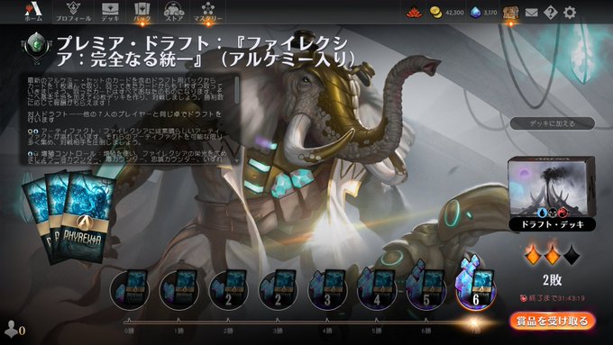 ファイレクシア:完全なる統一(アルケミー入り)ランクドラフト、ほぼアルケミーでは無い白緑で7-2です。