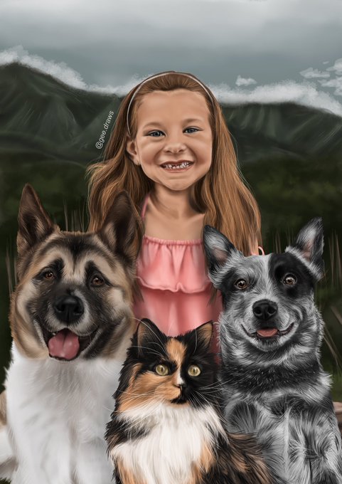 Some group commissions and a closer look at my website banner! Some of my favourite commissions 😍 #art #ArtistOnTwitter #dogs #dogsoftwitter #Commission #artist #digitalart #petportrait
