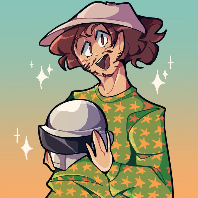 redraw of a 4 year old drawing of madeon holding thomas bangalter's helmet