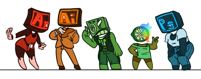 From left to right: Animate CC, Illustrator CC, Opentoonz, Paint Tool SAI, and Photoshop
