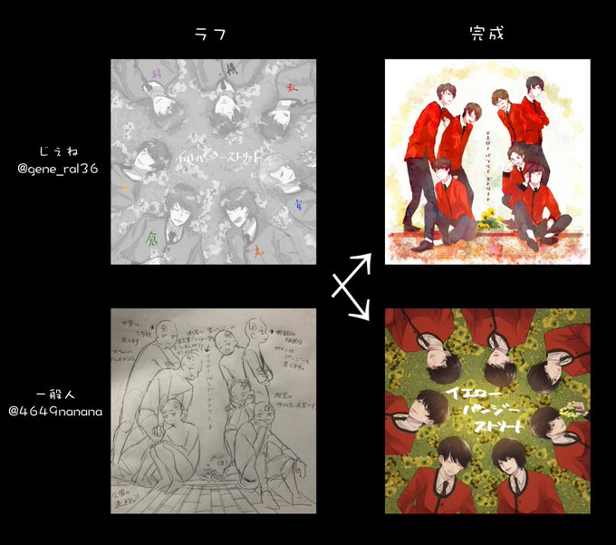 一般人さん(@4649nanana)とイエパンをお題にラフ交換しました! 自分では考えつかない構図楽しかったです! 私のラフを一般人さんが素敵に描いてくださったのでそちらもぜひ!