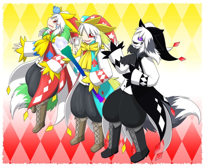 よく使ってる道化師アバター、現状僕を除いて7体しかいないうちの知ってる範囲の改変してくれてる人の個性が楽しいから並べてみたくなって描いてみた。