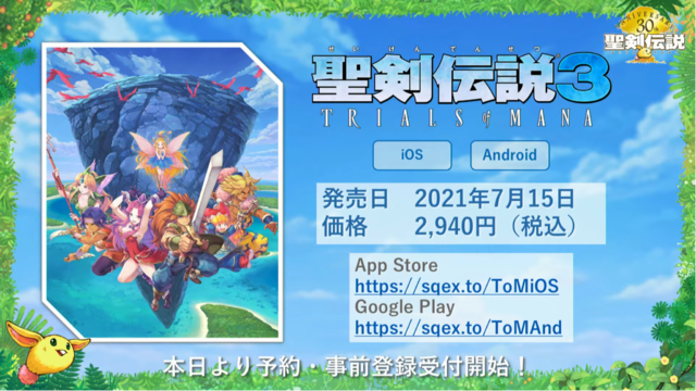 昨日はバタバタしてリアルタイムで聖剣伝説の生放送見れなかったんですけど、内容は、LOMのアニメ化、 新作ソシャゲ「エコーズ オブ マナ」、家庭用新作開発中、聖剣3のスマホ移植と考えうる最強の布陣で来ましたね。