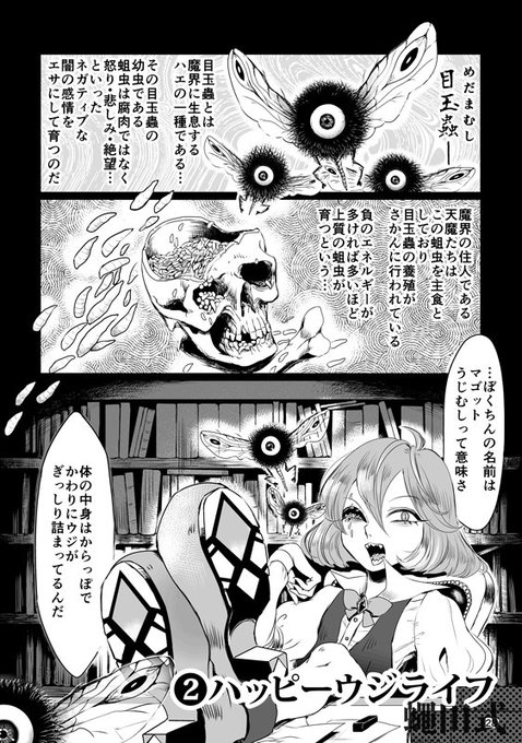 (ボブヘアの主人公が昇天する愛の物語)収録2話目『ハッピーウジライフ』・魔族の方々が蛆虫をおいしく食べる話です。🔹短編3話収録/A5/60ページ/600円 #コミティア