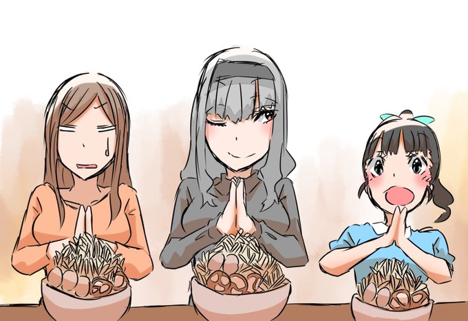 異次元の胃袋をもつ貴音さんと才能を開花させようとしている舞ちゃんと目の前のラーメンに絶句する久美子さん #モバマス版深夜の真剣お絵かき60分1本勝負 #モバマス版