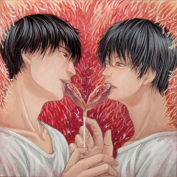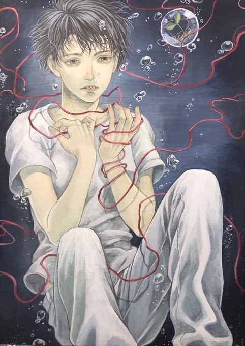 水中は内側のイメージをさします。今回は「運」がテーマ、運と聞いて出てきたのは「運命の赤い糸」そこから、繋がるめぐり合わせをイメージしました。気泡の中にひとつ浮いている芽が出た植物は、これから出会う人、物の関係を育てたいなという思いを描いた。