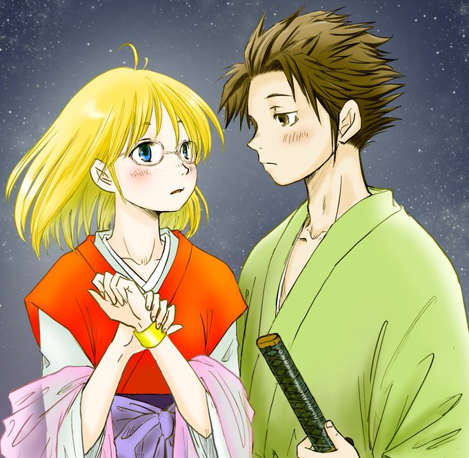 私の創作読み物「美剣伝」📖😸✨イラストはひなたぼっこ(@hinata__boko)さんが主人公 隼人とターシャを描いてくださいました🖼️😻💓💕