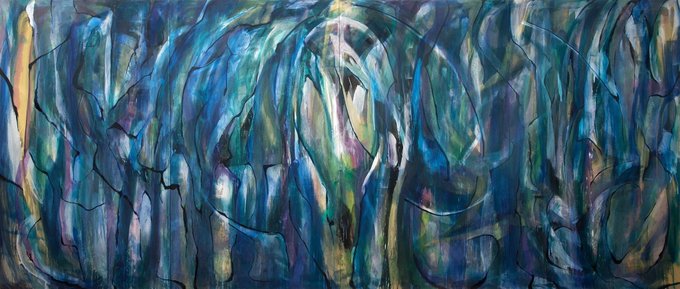 写真は、「壁の向こうに太鼓の響きが」キャンバス、アクリル、97×162cm、2022年の部分と全体。