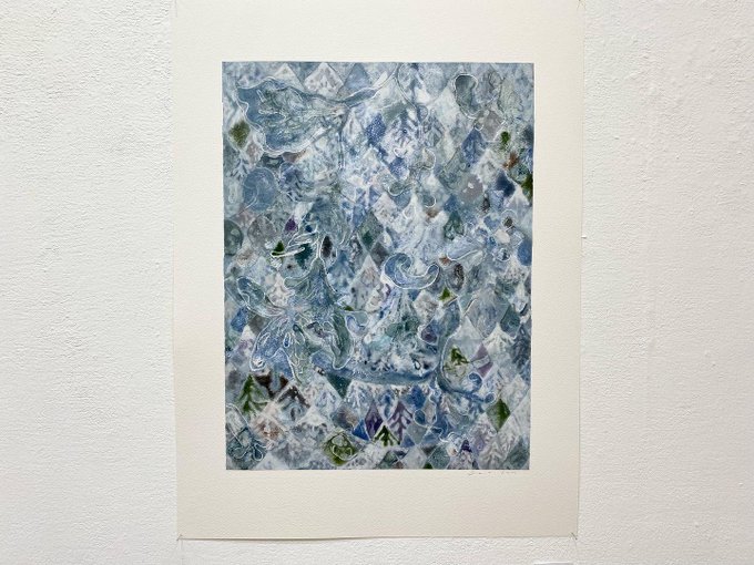 写真は、渡辺智子「winter drops」水彩紙、アクリル、54.0×41.0cm、2022年の全体と部分。絵具の多方向への広がりをお見逃しなく!