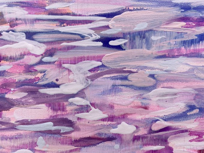写真は、スズキサチコ「One~Where are you?~No.92」キャンバス、油彩、116.5×116.5cm、2020年の全体と部分。白の筆跡の魅力をお見逃しなく!