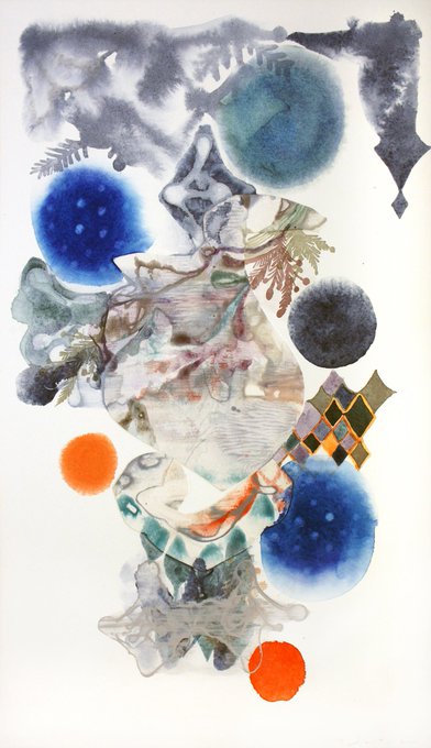 写真は、渡辺智子「呼吸」水彩紙、コラージュ、アクリル、透明水彩、55.0×32.0cm、2021年。いつもと異なる新鮮な空間のとり方やコラージュをお見逃しなく!