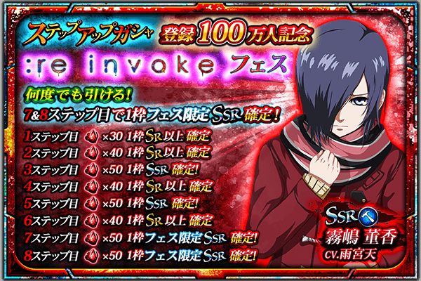 「東京喰種 :re invoke」ガシャ「:re invokeフェス」開催!フェス限定【SSR】霧嶋董香(CV.雨宮天)が新たに登場!7&8ステップ目で1枠フェス限定SSR確定!11/7(火)まで