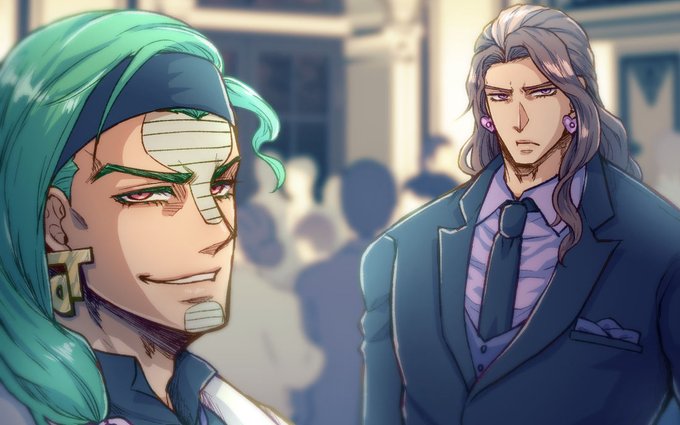 館組スーツ。信奉者が集まっている会場でDIO様のお供×2