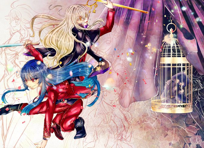 背景になる鳥籠などの塗り込みが終わり、メイン人物の肌、瞳、髪影2までの塗り込みが終わった状態です。