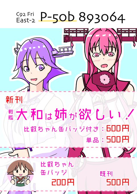 【C92のお知らせ】夏コミのお品書きを作りました。今回は前々から作りたかった缶バッジにチャレンジしてみました!新刊は大和比叡ですが、既刊は提督LOVE比叡もあります!東2ホールのP-50bでお待ちしております。よろしくお願いします〜♪ (๑╹ω╹๑ )