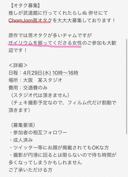 【オタク募集】 4月29日(水)大阪にて 推しが/武道館に行って/くれたら死ぬ 併せにて、ChamJamオタクを募集しております! 性別不問なのでサイリウムを振ってくださるだけでもOKです! ご興味のある併せ参加者の相互フォロワーさんのご連絡お待ちしております‼️