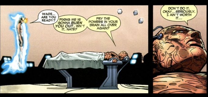 Cable frying out his telepathic powers to get Wade's lost memories back was such a pivotal moment to me around Cable's character because it not only showed how much he cares for and likes Wade, to do this to him, it really gives a small hint on how he views this power