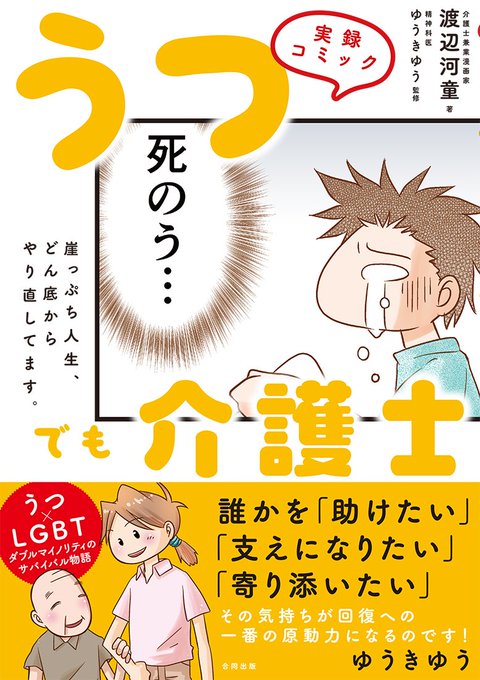 『実録コミック うつでも介護士』(渡辺河童、ゆうきゆう 監修、2019年)誰かの役に立つ仕事がしたい! 重度うつ病と戦いながら介護士になり、再び生き始めた漫画家がセキララに綴ります。介護士資格取得のノウハウや、訪問支援についての説明も充実👍だいじなことを教えてくれるミニかっぱにも注目!