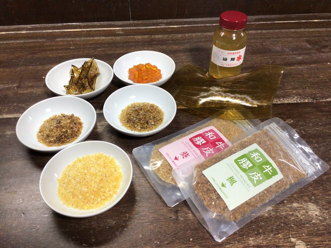 なぜ三千本という名前なのか…牛さん1頭からおよそ三千本この膠がとれるからだそうです。和膠にはゼラチン質だけでなく灰分や油脂分なども含まれています、それが柔軟性を生み、巻物などにも使用できる伸びの良い接着剤となるのです。和膠は遠い昔から日本人に親しまれて来ました。