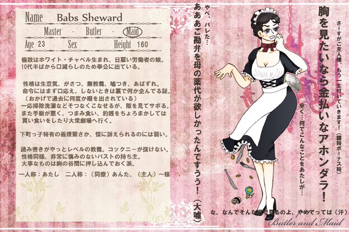 @sousakuTL 拙宅にメイドとかいないだろとか手繰ってみたらその昔企画で一人いました。執事というか使用人はお嬢さん3人にしばきまわされてる奴が一次創作に一人。