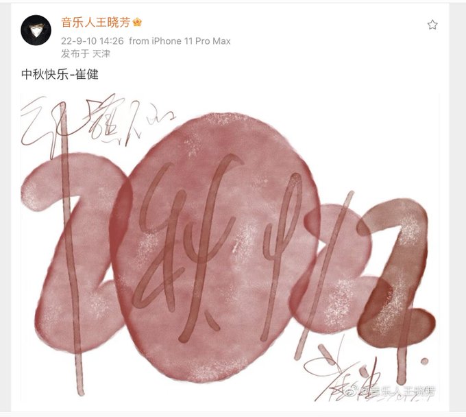 崔健が王晓芳さんに送った中秋節のグリーティングカード。 2022以外、読めそうで読めない。 https://t.co/2D4qDUOsY0