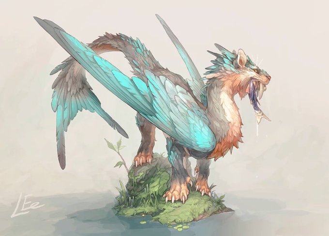 背の高い樹が茂った森に生息している羽猫。樹の間に流れる川や湖に飛び込んで魚を捕る。毛と翼は堅めで撥水性。水中では羽と尻尾をヒレのように使って泳ぐ。