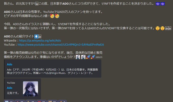 ADOとのコラボNFT、トークンエアドロや第二弾の優先権、美容外科との提携などユーティリティ満載❣