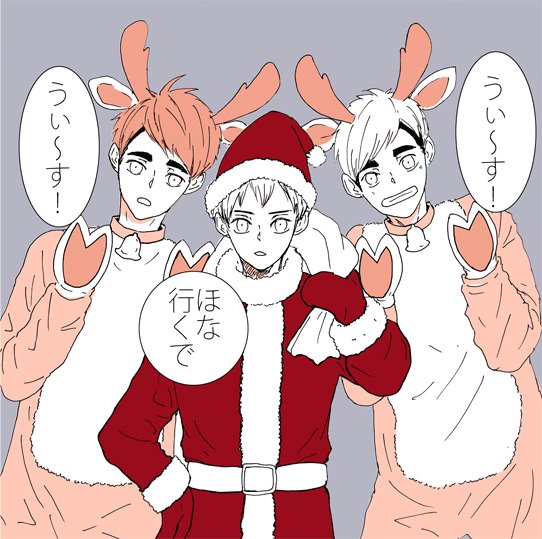 遅刻ながら北さんサンタに宮兄弟のトナカイさんでクリスマス!北さんサンタはきっちり枕元にプレゼント置いて行きそう。こっそりが信条だけど、外で待つ宮兄弟トナカイが喧嘩したりして騒ぐもんだから「静かにせい!」って叱ると子供たちに気付かれる。