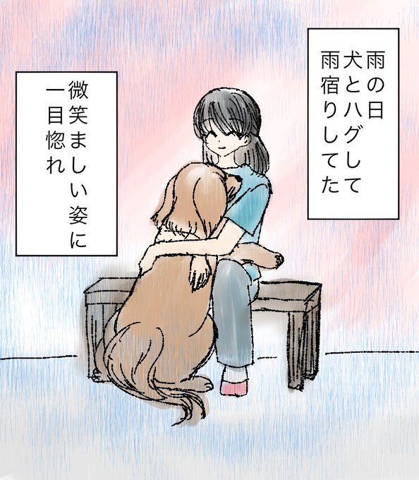 突然の雨に振られて雨宿りしてた飼い主さんとワンコ見かける。遠目で見た時は親子でハグしてるかと思った。ぎゅーってしてる姿に釘付け。