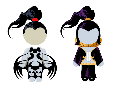 The two costume changes. Oya's been in this costume for a while now, I think, but I used an older reference the first go-round!