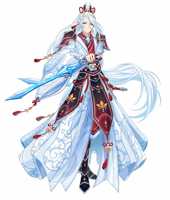 Here's the full illustration for Xue Ying! He's (for his au) the former Cryo Archon who lost his gnosis early on, via a painful chest injury that also took his voice. He's henceforth lived a simple life roaming the far lands, dressed in clothes from Liyue from an age long past. https://t.co/gDhrFU8h3j