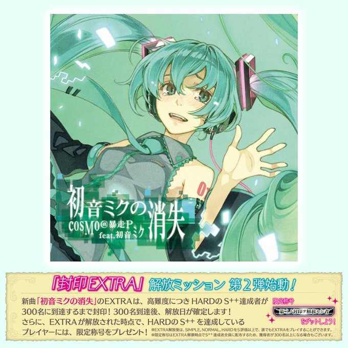 【AC】本日から「初音ミクの消失」のEXTRAステージを開放しました!SIMPLE~HARDをS以上でプレイ可能です。また、7/25 午前6時までにHARDでS++達成した皆様には限定称号を配布しました! #グルコス