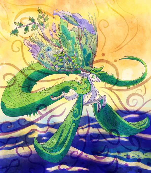Greenheart Azreyfel, from 2018! One of several "dragon posing around a tree with a piercing but neutral look" drawings i've done in an attempt to synthesize peak aesthetic, lol 😂
