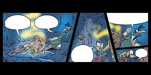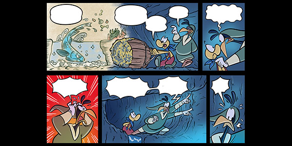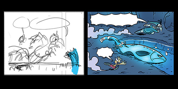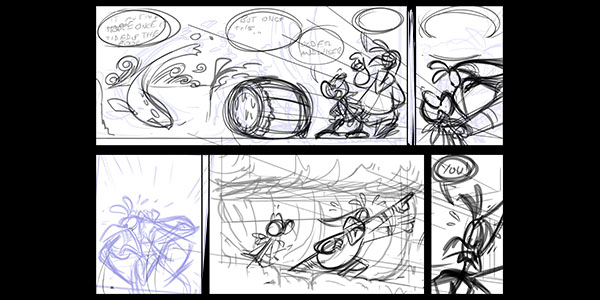Roughs from Page 39. Here I merged two panels together, and swapped two drawings to better suit Vector's dialogue.