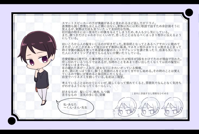 こちらの企画【@koi_thudu】に3人目失礼します!一見とっつきにくいですが割とフレンドリーな美容学科教師です。事前で友人がいますがその他は真っ白なので遊んでいただけると嬉しいです!よろしくお願いします~! #恋続_CS #恋続_美容学科 #恋続_教師