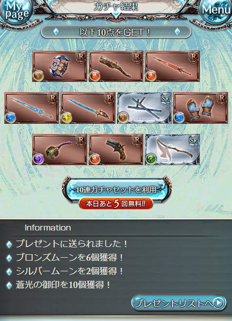 グラブル 天井ガチャ~SSRキャラの新しい子は4人。 SSR月が8個。 <オーキス2・ソリッズ・アン・ガンダゴウザ・光サルナーン・火ゼタ・水アルルメイヤ クリスマスキャラ…マギサ…セルエル…ナルメア… 火マギサと闇ナルメアも持ってない… でもキャラが(月でも)沢山来たのは嬉しい