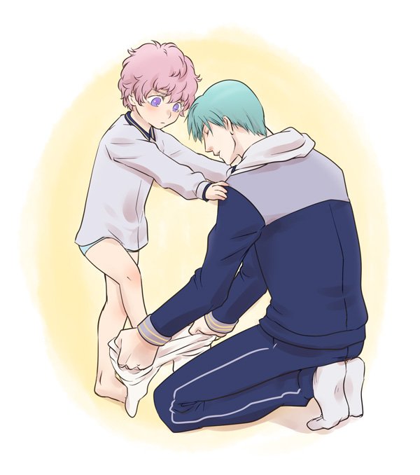 秋田くんはおひざの裏がゴワゴワするし子供っぽくてイヤだな兄さん達みたいにソックスがいいなあと思ってるけど、朝のお着替えの時にいちにいさんが嬉々としてタイツ履かせる体勢を取るので不本意ながら着用しているのでは。という妄想を絵にしました
