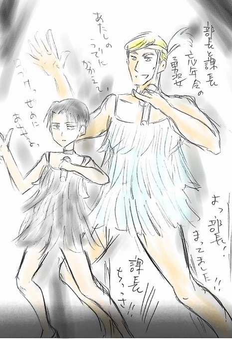 エルヴィン部長とリヴァイ課長、忘年会の勇姿のピンクレディ 部長は案外ノリノリ、課長は道連れだけどその完成度は高い(女装注意)