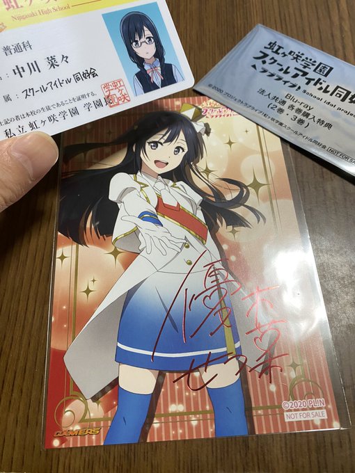 せつ菜ちゃんの箔押しサイン付きポストカードも貰えたのでヴァイスでサイン当たらんでもよくなったし、学生証はランダム3種類だったのに一発で菜々ちゃんきてくれて燃えるような嬉しさ🔥