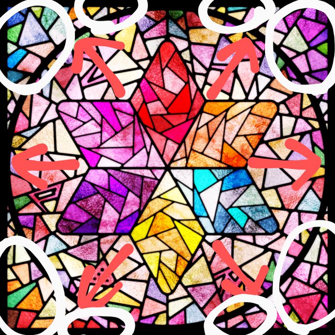 左下の黄色丸を見ると分かるように円の外側・内側で反対色使ってます (これは黄色と紫色) フィルターですとぷり色である赤やピンク系の色にしたので分かりにくいかもですが…