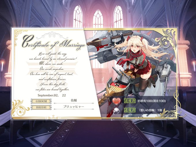 まだ寝ないけど、みんなおやすみ〜💫!!今日は、ユニオン勲章の獲得、それで全陣営の勲章が揃った。ブリュッヒャーちゃんを含めた艦隊で13章周回したら、愛になり結婚💍❣️❣️✨