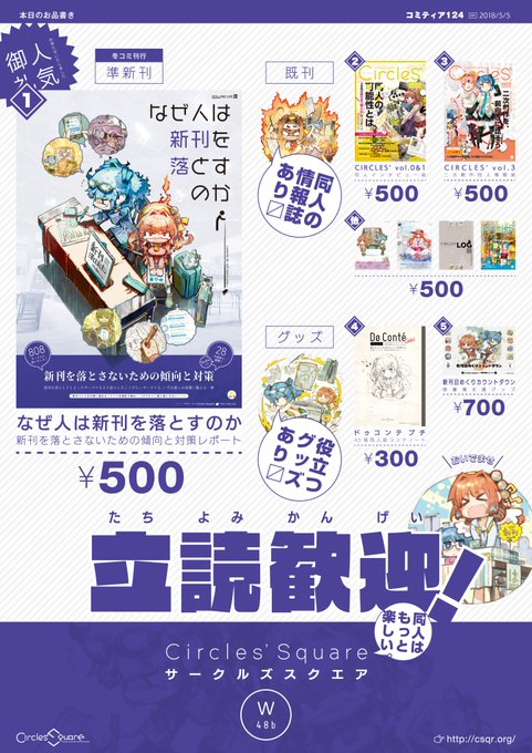 【お品書き作りました】5/5(土)開催のコミティア124に「Circles' Square」もサークル参加いたします! 前回のコミティアに参加できなかったため、冬コミの新刊を準新刊としてアピールする玉虫色の攻め方ー!! 関東圏以外の同人ショップでは売り切れかつ増刷未定ですのでお求めの方はぜひぜひ