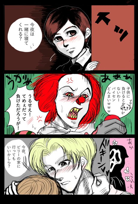 #リプ来たキャラを赤面させる @kon_46 @inuituki @iyomodoki ふゆぉさん→ザ・ボーイのブラームスくん 乾さん→ペニーワイズ さいたにさん→スクリームのビリー君です!///