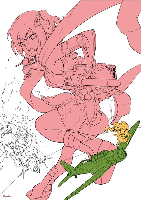 艦これ・川内と97式艦攻 一番塗ってて楽しいのは…爆破ですよ…(恍惚) #皆さん線画と塗った後を見せてください