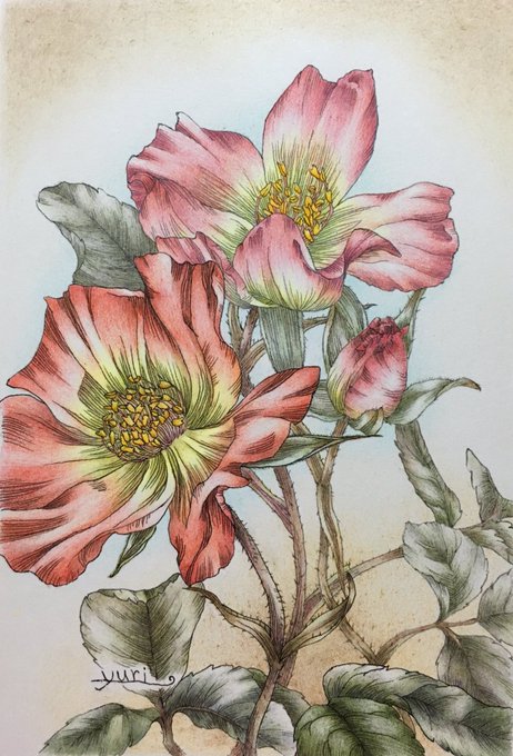 過去絵ですみません~ ハガキサイズ、アイコンの絵ですわ 一重のバラ……バラに見えないかも💦 こわばりがひどくて、携帯持つのと、文字打つのがしんどいため、リプへのお返事遅れて大変申し訳ないです 闘病頑張れ~!と思って頂けたたら、♡下さい^^ #ペン画 #色鉛筆 #線維筋痛症