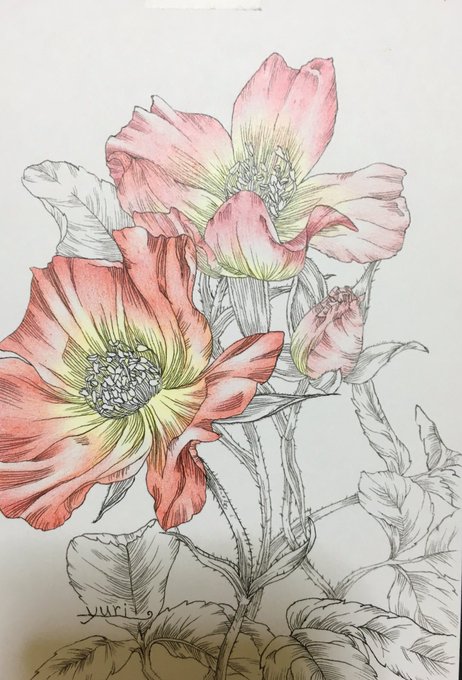 全くブラック、グレー系を入れないで描いてみたらどうだろう?と塗り進めたけど、葉っぱ黒にしたら楽しいかも?といきなりブラック系へ。そろそろ花にも影入れないとバランスが分からん…… #ペン #色鉛筆 #植物 #花