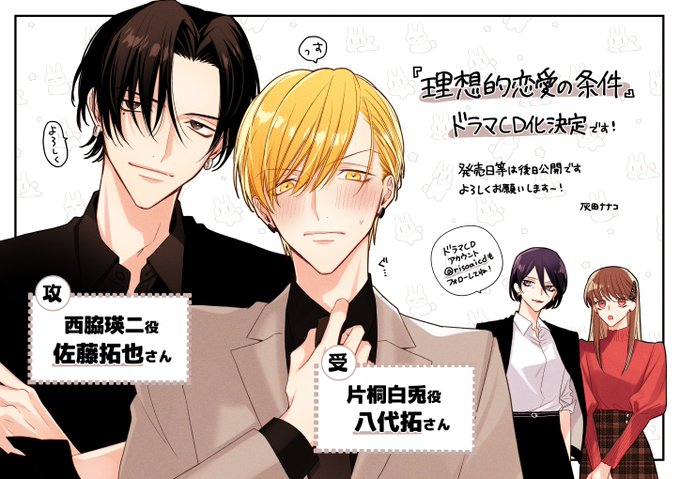『 #理想的恋愛の条件 』ドラマCD化が決定しましたー!素敵なキャスト様に演じていただけることになってワクワクです!どうぞよろしくお願いします🐰💗