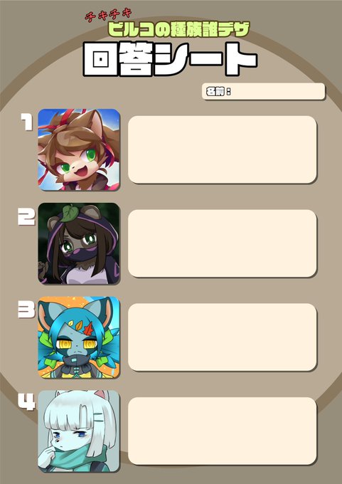 ビルコちゃんの種族(化け狸)の誰デザ! 私は1番の絵を担当しましたーー🍃 ぽこさんが回答シートも作ってくれたので是非ー!