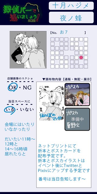 けもじwebオンリー「探偵バーで逢いましょう!」のお品書きをお知らせします。 当日は交流もさせていただけたら嬉しいです🥰よろしくお願いします〜! 夏野火ポスカはまだ線画ですがこんな感じのイラストに…したいです! 隠ミハポスカは夜明け前に2人で事務所ビルの屋上(あれば😅)で飲んでる感じです